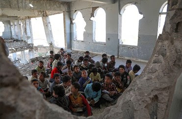 Escola improvisada nos escombros da guerra